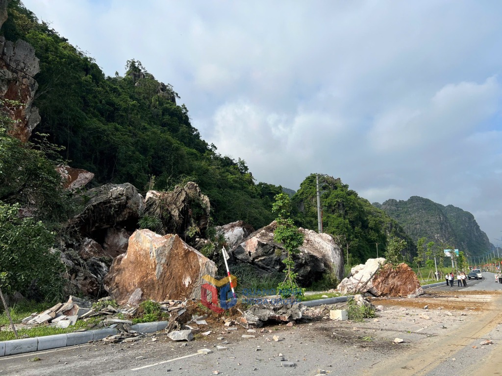 Ít nhất 3 tảng đá nặng hàng trăm tấn cùng hàng trăm viên đá lớn nhỏ vỡ vụn, từ vách núi rơi xuống đường bao biển Hạ Long – Cẩm Phả (tỉnh Quảng Ninh) trong điều kiện thời tiết khô ráo.