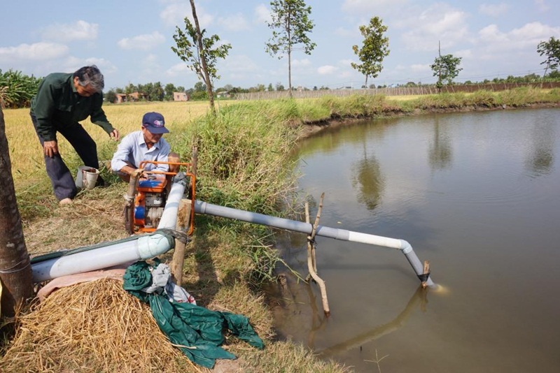 Ông Trịnh Đình Thảo (ngụ ấp 5) cho hay thời tiết nắng nóng khiến nhiều người tự đi xe máy, xe đạp đến ao làng múc từng can nước về dùng. Mặc dù vậy, theo ông Thảo, nước ao cũng ô nhiễm do người dân nuôi cá và khu vực trồng lúa xung quanh sử dụng phân thuốc hóa học.