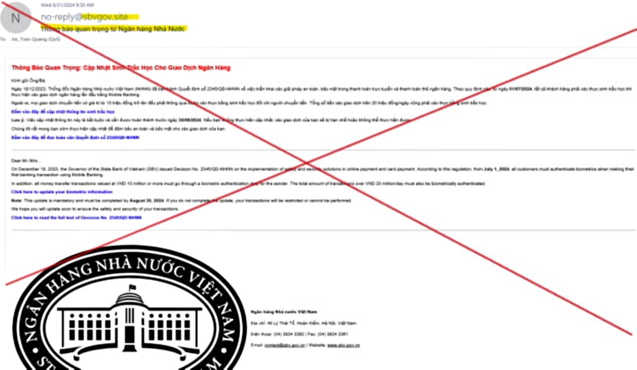 Ngày 23/8, Ngân hàng Nhà nước phát thông tin cảnh báo về việc bị mạo danh, lấy lý do cơ quan này yêu cầu cập nhật thông tin sinh trắc học, khiến nạn nhân bấm vào đường link lừa đảo, từ đó chiếm quyền kiểm soát thiết bị cá nhân, tài khoản ngân hàng.