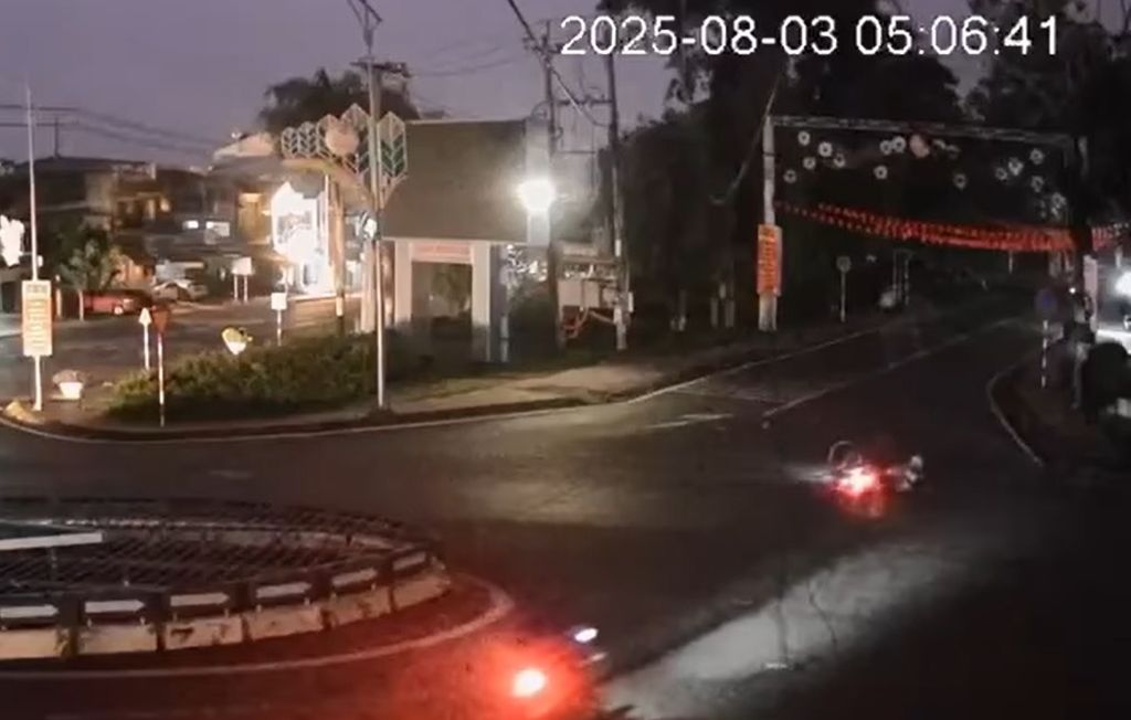 Vừa đi qua vòng xuyến, một người đi xe máy bất ngờ bị hất ngửa xuống đường, xe máy văng ra xa. Hình ảnh trích xuất từ camera an ninh cho thấy một đoạn dây cáp viễn thông dài giăng mắc giữa đường.