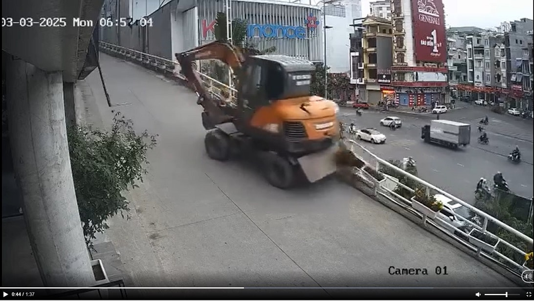 Khoảnh khắc máy xúc tuột dốc rơi xuống. (Video: dẫn qua Facebook)