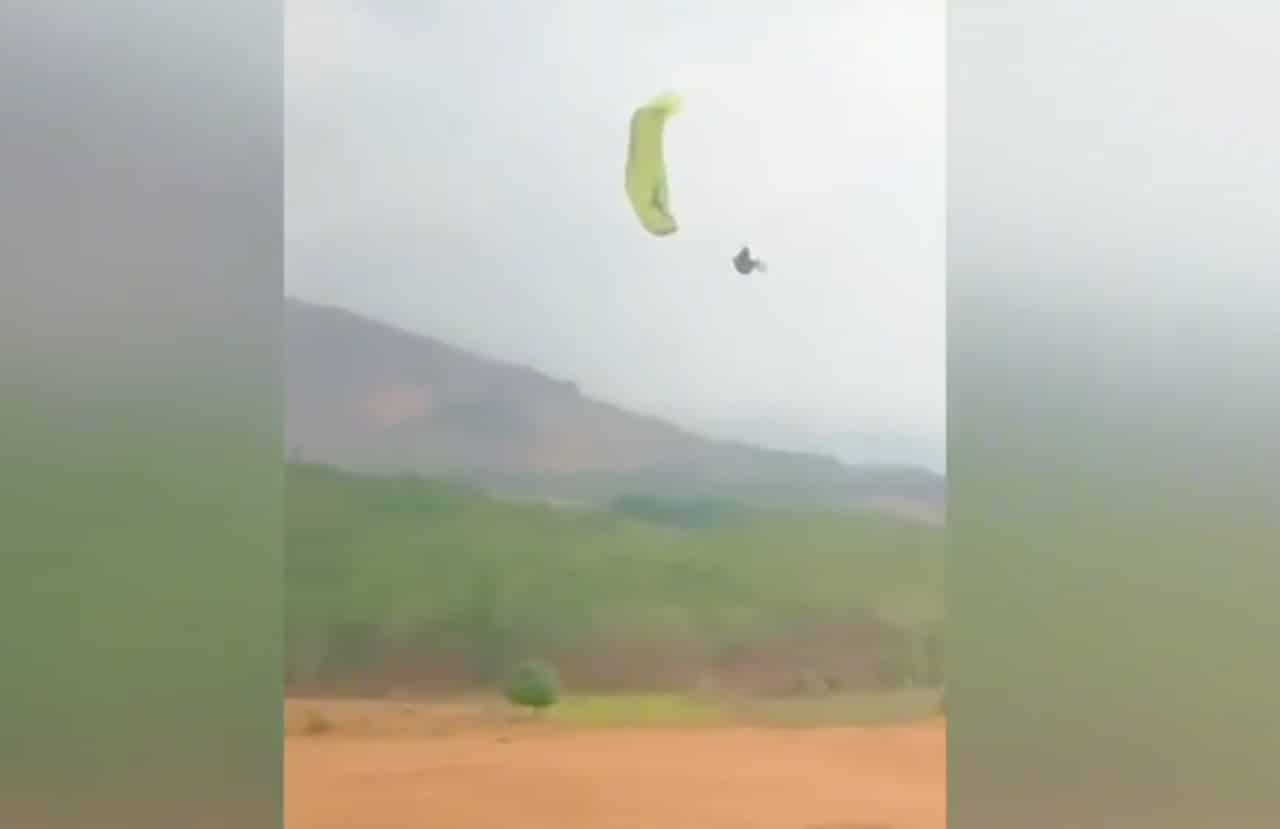 Theo clip do người dân ghi lại, khi hạ cánh, tại khoảng cách 20m so với mặt đất, dù lượn của phi công này bị lệch khiến nam phi công rơi tự do xuống đất.