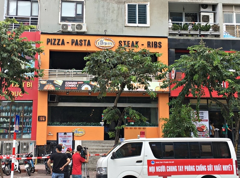 Theo ghi nhận của báo này, tại khu vực cửa hàng pizza số 106 Trần Thái Tông, công an căng dây phong tỏa một khoảng 30 m quanh nhà hàng; khoảng 10 nhân viên trong cửa hàng được yêu cầu đeo khẩu trang và không ra ngoài.