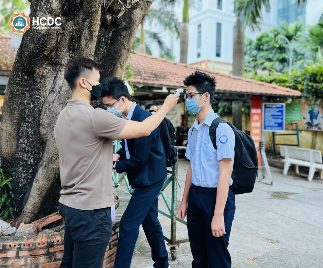 Học sinh được đo thân nhiệt, sát khuẩn tay khi vào trường. (Ảnh: HCDC)