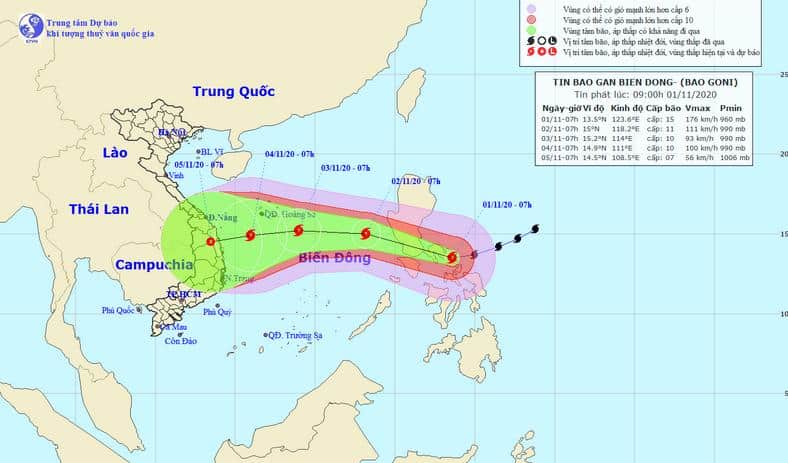 Hồi 7h ngày 1/11, vị trí tâm bão ở khoảng 13,5 độ Vĩ Bắc; 123,6 độ Kinh Đông, trên khu vực miền Trung Philippines. Sức gió mạnh nhất vùng gần tâm bão mạnh cấp 15 (165-185km/giờ), giật cấp 17.
