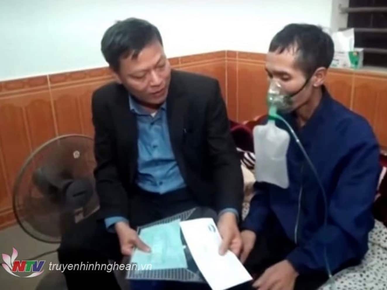 Đại diện lãnh đạo MTTQ huyện Nghi Lộc đến thăm hỏi công nhân bị mắc bệnh bụi phổi khi làm việc tại Công ty Châu Tiến. (Ảnh: truyenhinhnghean.vn)