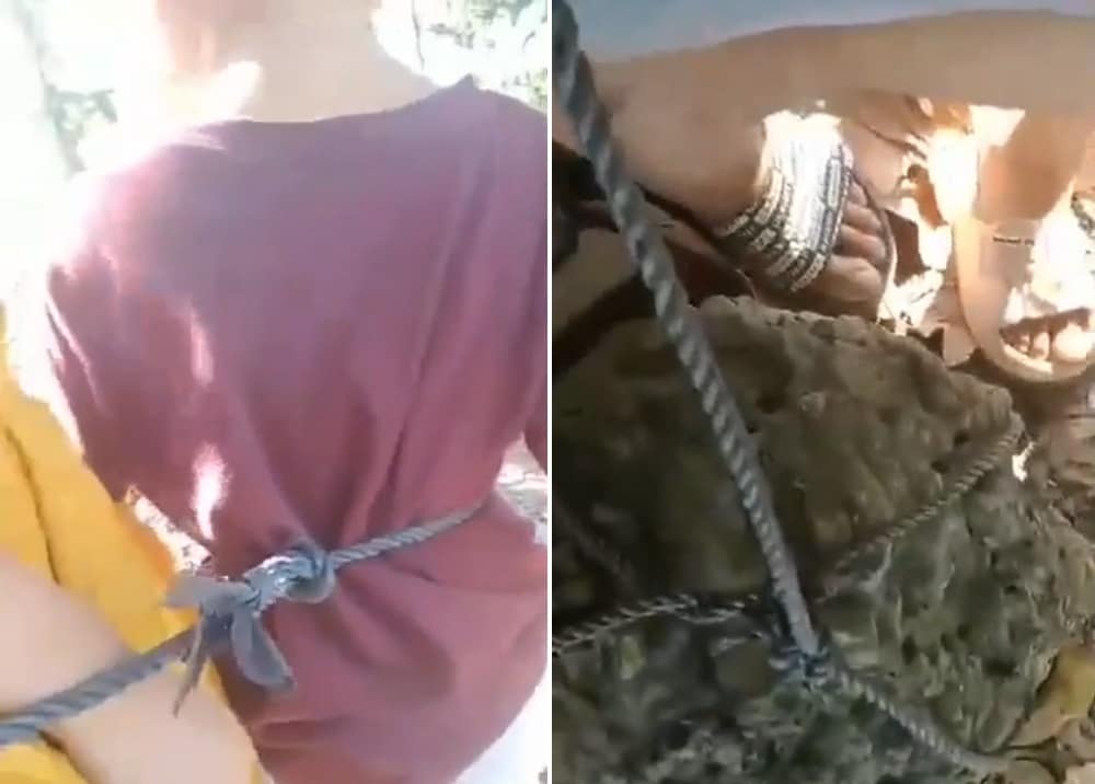 Ba đứa trẻ từ 4 đến 7 tuổi bị một người đàn ông buộc dây thừng chung vào một tảng đá lớn. Trong video do người đàn ông tự quay lại, những đứa trẻ gọi người đàn ông là ba, giọng ngây thơ liên tục hỏi “Ba rinh xuống hả ba?”…