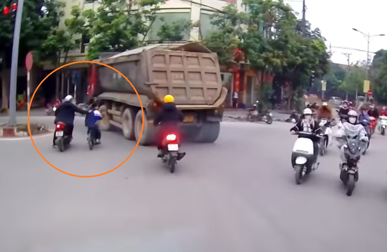 Trong video, hai người đi xe máy cùng một chiếc xe tải đi qua ngã tư, chuẩn bị rẽ sang trái. Lúc này, giữa ngã tư xuất hiện một cháu bé mặc đồng phục học sinh đi xe đạp, bị cuốn theo hướng rẽ của xe tải. Nhận thấy cháu bé đang dần đi vào điểm mù của xe tải tại khúc cua, một người đàn ông đi xe máy nhanh chóng tăng ga đi lên, kéo cháu bé lại.