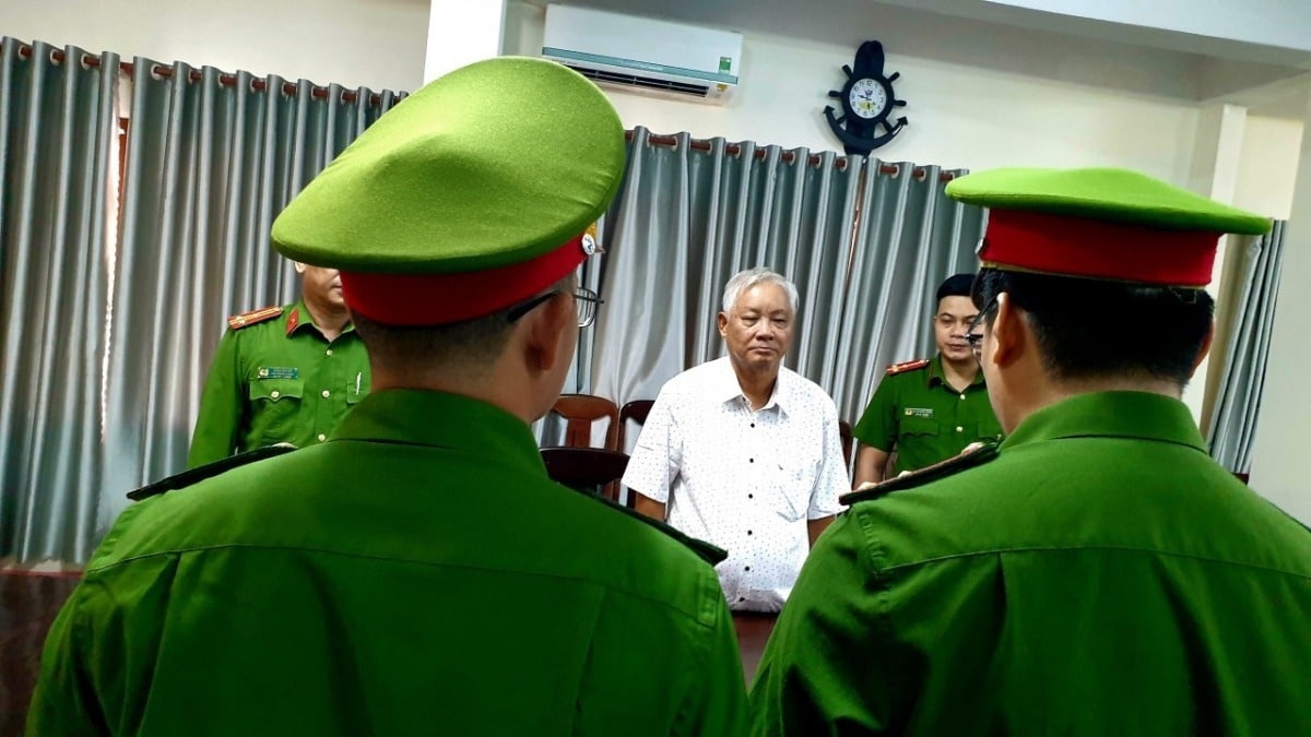 Ông Phạm Đình Cự, nguyên Chủ tịch UBND tỉnh Phú Yên nghe công an đọc lệnh khởi tố, bắt tạm giam. (Ảnh: vov.vn)