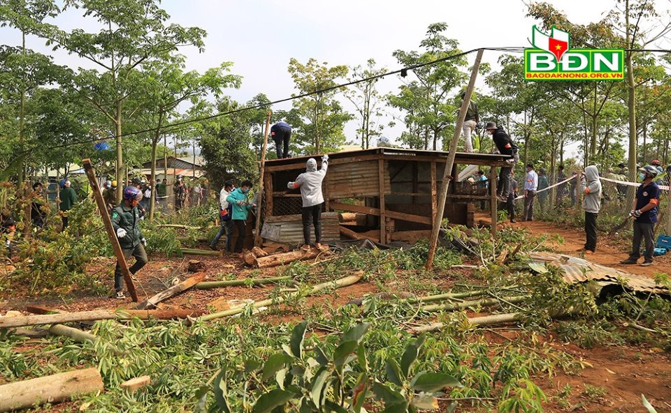 Tại hiện trường cưỡng chế thu hồi, trên phần đất lấn chiếm, nhiều hộ dân đã xây dựng nhà cửa, trồng cây nông nghiệp… UBND huyện Đắk Glong nhấn mạnh quan điểm là người dân tự nguyện trả lại diện tích đất đã lấn chiếm, hoặc bị cưỡng chế thu hồi, không đền bù.