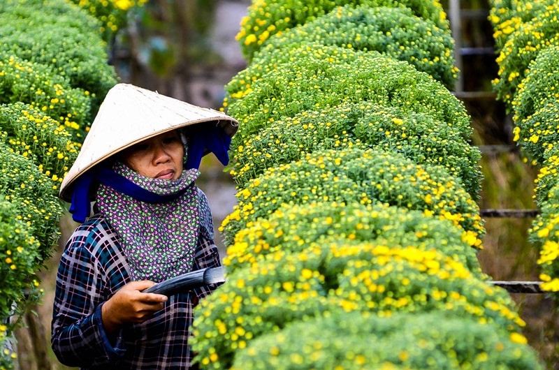 Trải qua hơn trăm năm bồi lắng bên dòng sông Tiền, miệt vườn xứ hoa Sa Đéc (tỉnh Đồng Tháp) đã trở thành nơi nuôi dưỡng sinh kế cho biết bao thế hệ. Nông dân trồng hoa kiểng vì chuộng cái đẹp mà tìm đến hoa để chiêm ngưỡng, để trồng trọt và chăm sóc, rồi mong sao người ngắm hoa, chơi hoa cũng nâng niu như thế…Bốn mùa đều là hoa, nhưng tới xuân thì làng hoa Sa Đéc vội vã hơn cả. Được coi như thủ phủ hoa của miền Tây, hoa từ nơi đây sẽ đổ đi khắp xứ Nam, ra Bắc.Từ vài hộ trồng hoa kiểng để thưởng lãm vào cuối thế kỷ 19, giờ làng hoa có khoảng 2.300 hộ trồng hơn 2.500 chủng loại hoa, cây cảnh, từ truyền thống như cúc mâm xôi, hồng, sao nhái đến các loại mới được du nhập như tiểu la lan, cát tường, sao băng…Vì là vùng có địa thế thấp, làng hoa Sa Đéc khác lạ với làng hoa xứ hoa ở Đà Lạt hay Hà Nội. Luống hoa là những giàn cao tránh nước. Nông dân chăm hoa phải đi ủng hoặc dùng thuyền di chuyển.Nông dân chăm hoa hay lo, lo hoa gãy đổ, lo cây hoa ra không đúng vụ Tết. Canh đúng vụ thời tiết tốt thì hoa nở đúng dịp. Còn không, hoa nở trước hay qua Tết thì giá thấp chỉ còn một nửa.Không chỉ có hạt giống gieo vào trong đất, một chậu hoa cần được chăm từ phân bón, giá thể, rơm, tới kinh nghiệm biết “đọc” nắng mưa. Mưa kéo dài và nặng hạt sẽ khiến hoa bị dập lá, gãy cành. Mưa gây lạnh cũng khiến hoa “ngủ đông”, nở sau Tết.Mỗi chậu hoa như đứa con cưng, hoa rời giàn là khi hoa đã lớn, đủ rời tay chăm nom để dành cho người thưởng lãm.Đội cả “mùa xuân” đi bán. Cúc mâm xôi của một hộ nông dân đang được rời giàn gần hết.Bước chân của người trồng hoa ngập trong sình.Từ những năm đầu thế kỷ 19, theo bước chân của người Pháp, các giống hoa kiểng được du nhập, biến Sa Đéc thành “vườn hoa của xứ Nam Kỳ”. Nhưng gìn giữ, nuôi dưỡng vùng đất ấy thành xứ hoa như hôm nay, cần phải kể tới bàn tay của nhiều thế hệ nông dân Nam Bộ.Tới nay, tiếp nối các bậc cha chú, những vườn hoa nức tiếng xứ Sa Đéc như vườn hồng Tư Tôn, bác Tư Mạnh, Hai Nhiều, Hai Tý… đã đón thế hệ người trồng hoa thứ ba, thứ bốn.Có người nói, vì cái đẹp của hoa, lại cũng vì cái nhọc nhằn đằng sau mỗi chậu cây, bông cúc mà nghề trồng hoa kiểng như một cuộc hội ngộ. Hội ngộ giữa những lo toan, vất vả mà kết tinh thành sắc hương không lời.