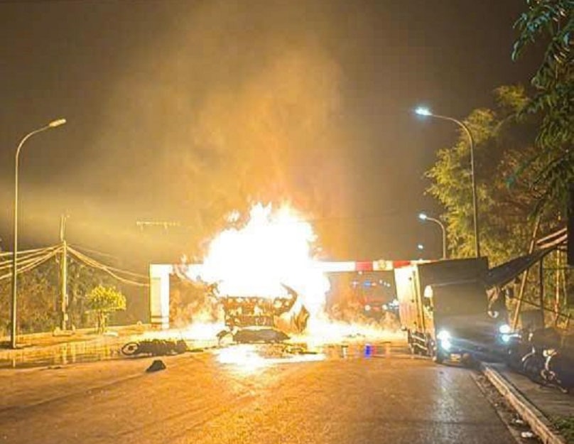 Ngọn lửa bùng lên cao, nhanh chóng thiêu rụi toàn bộ chiếc xe. Một xe ô tô tải chở bình nước uống đỗ bên vệ đường bị ảnh hưởng bởi vụ nổ, hư hỏng theo.