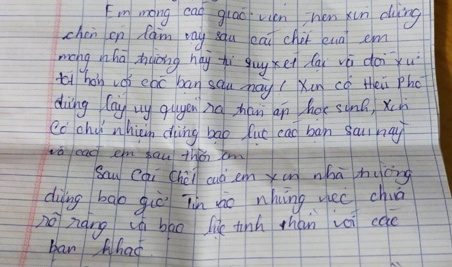 Theo thông tin từ người thân học sinh, sáng 30/11, gia đình nhận được tin từ nhà trường báo em N.T.N.Y bị ngất trong trường. Bà Nguyễn Thị Quyết (55 tuổi, mẹ Y.) nói sau đó mới biết con để lại 2 lá thư tuyệt mệnh, có nội dung lấy cái chết để chứng minh mình không phạm lỗi như trường đã xử lý.