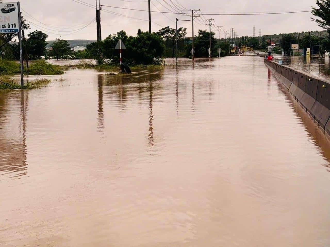 Từ khoảng 2h sáng 4/12, người dân tại xã Hồng Sơn, tỉnh Lâm Đồng cho biết nước lũ bắt đầu dâng cao trên quốc lộ 1 đoạn km1678 gần ngã ba Gộp. Mực nước tại một số vị trí vượt quá 2 m, khiến nước chảy xiết như sông và các phương tiện không thể lưu thông qua khu vực này.