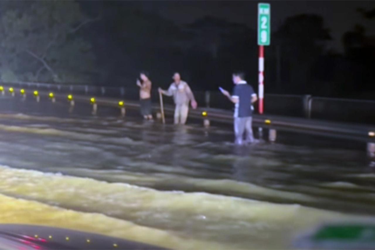 Nước lũ tràn lên cao tốc Hà Nội – Thái Nguyên, đoạn qua xã Trung Giã, TP. Hà Nội, gây ngập sâu 20-40 cm. Lực lượng CSGT đã phân luồng giao thông và khuyến cáo tài xế giảm tốc độ.