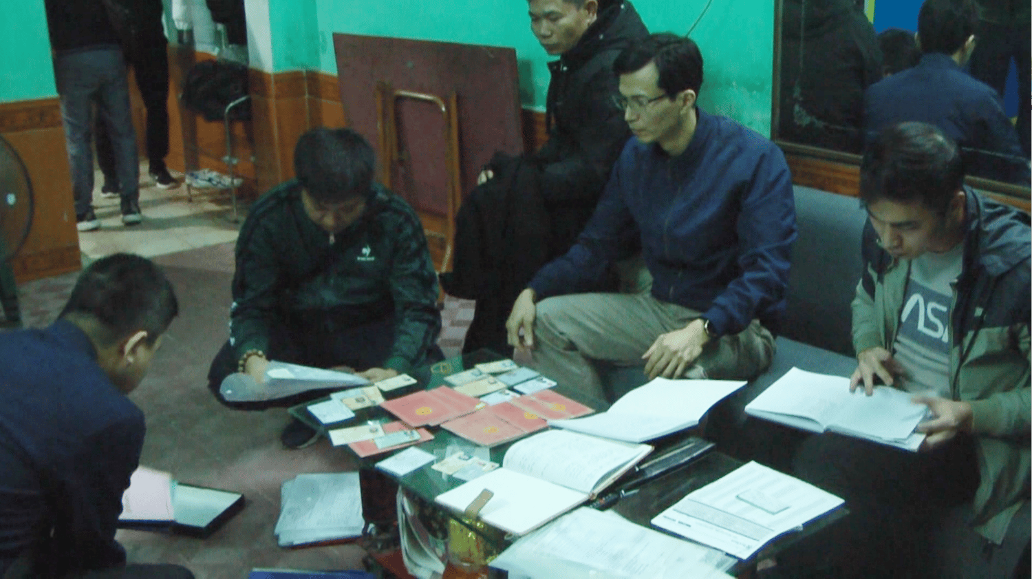 Đêm 21/12, lực lượng chức năng ập vào khám xét nơi ở của nghi phạm Định tại số nhà 17 phố Lý Thường Kiệt, thị trấn Quảng Hà, huyện Hải Hà, tỉnh Quảng Ninh, thu giữ 1 xe ô tô, 5 điện thoại di động, 1 máy tính bàn, nhiều hợp đồng, giấy vay tiền, sổ hộ khẩu và nhiều giấy tờ thế chấp khác.