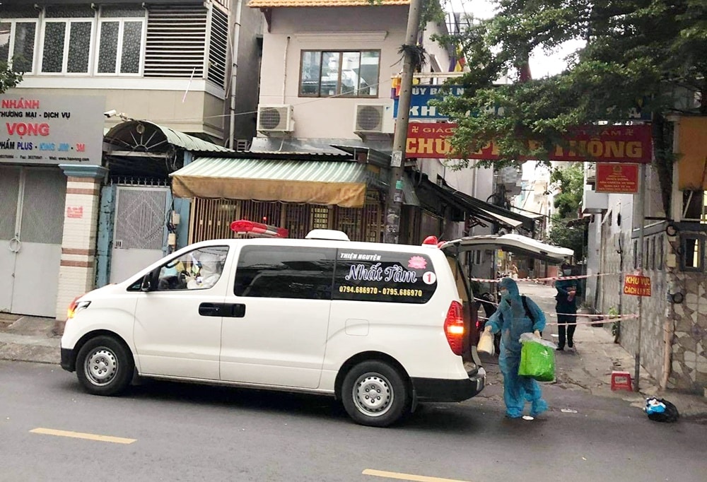 Một xe y tế đón 1 F0 và 2 F1 tại hẻm 187 Cô Giang (quận 1, TP.HCM), chiều 15/7. (Ảnh: Tôi là dân quận 1/Facebook)