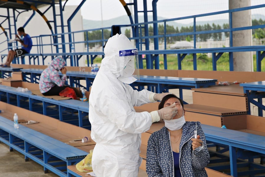 Nhân viên y tế của Trung tâm Kiểm soát bệnh tật lấy mẫu cho đối tượng nghi ngờ mắc Covid-19 tại công ty Crystal MarTin Việt Nam tại KCN Quang Châu (Việt Yên, Bắc Giang), sáng 17/5/2021. (Ảnh: syt.bacgiang.gov.v)