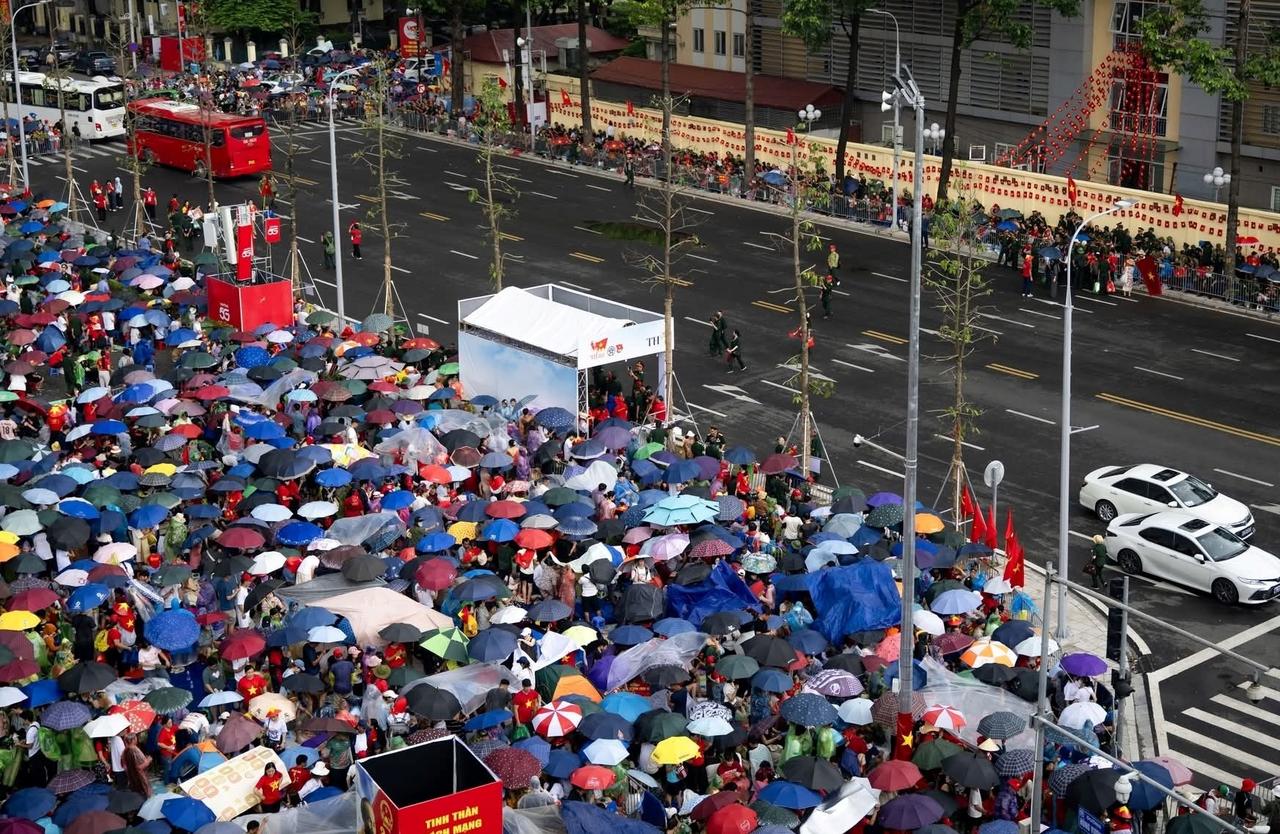 Mưa lớn gây khó khăn cho người dân, nhiều người phải đội mưa chờ xem diễu binh tại các tuyến phố như Nguyễn Thái Học, Thanh Miến, Hoàng Diệu trong ngày 1/9.
