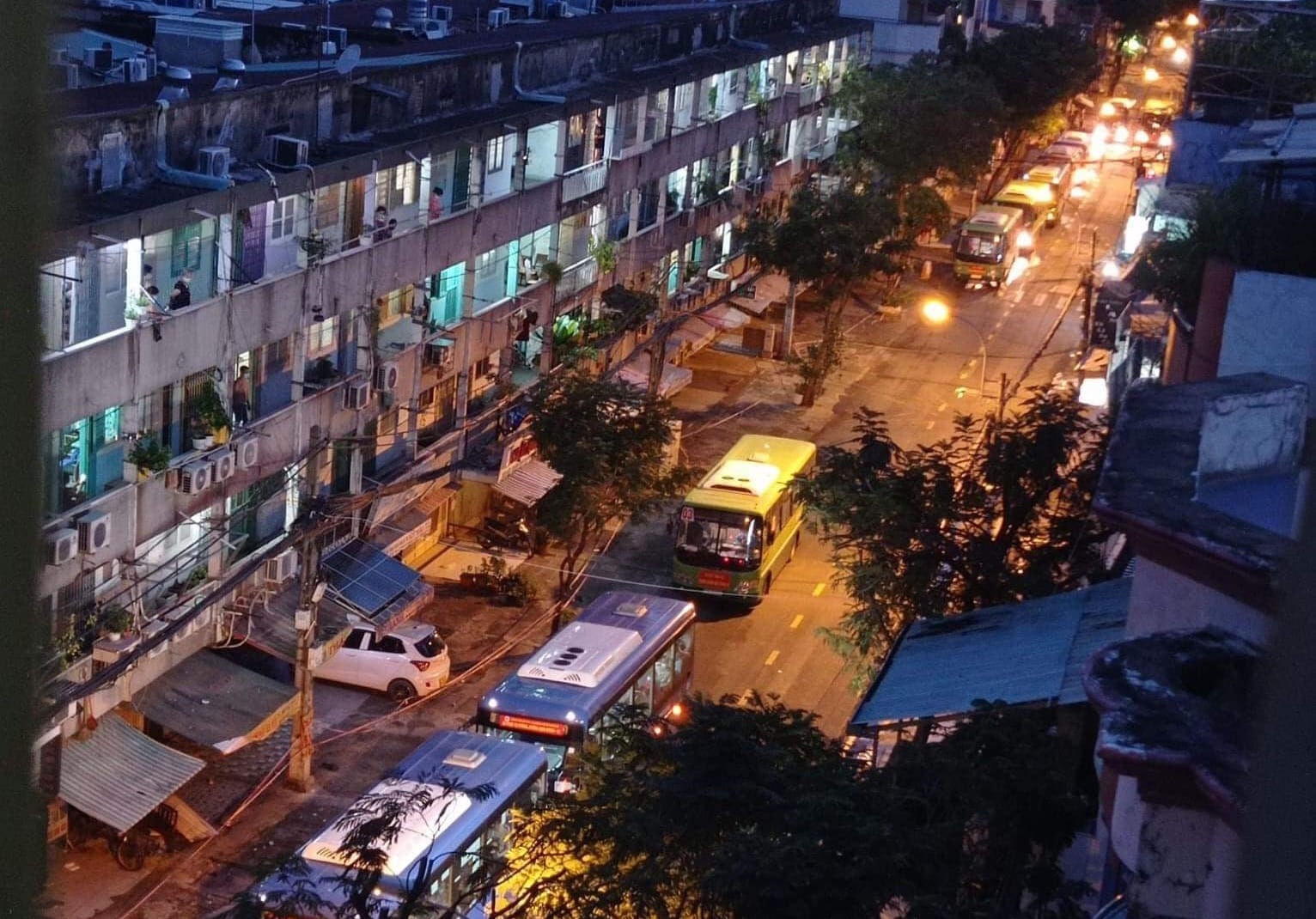 Dòng xe buýt lớn đưa F0, F1 đi cách ly, tại chung cư Ấn Quang (phường 9, quận 10), tối 27/7. (Ảnh: Hellen Nguyễn/Tôi là dân quận 10/Facebook)