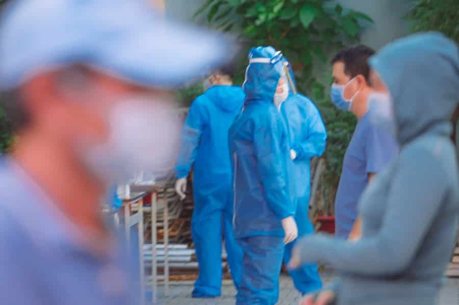 Những người dân đợi lấy mẫu xét nghiệm COVID-19 đi lướt qua một nhân viên y tế. TP.HCM đang đối diện cuộc khủng hoảng sâu do dịch COVID-19 bùng phát trên diện rộng, tháng 6/2021. (Ảnh: CTV/Trí Thức VN)