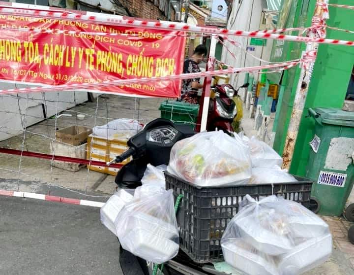 Cơm từ thiện được nhóm thiện nguyện chuyển tới một khu dân cư bị phong tỏa tại phường Tân Thuận Đông (quận 7, TP.HCM), tháng 8/2021. (Ảnh: Tài Võ/Tôi là dân quận 7/Facebook)
