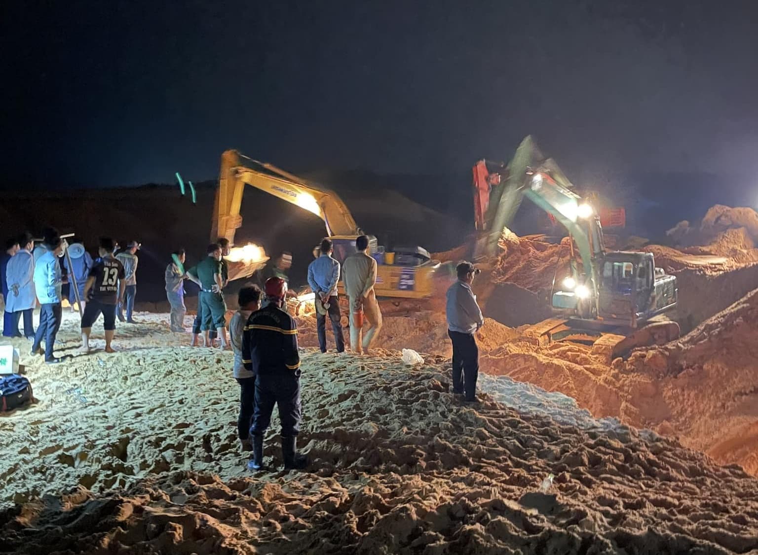 Hiện trường tìm kiếm các nạn nhân mất tích trong vụ sập mỏ khai thác titan, đêm 15/10. (Ảnh: Trang Lê/Kênh Truyền hình Quốc hội tại Bình Thuận/Facebook)