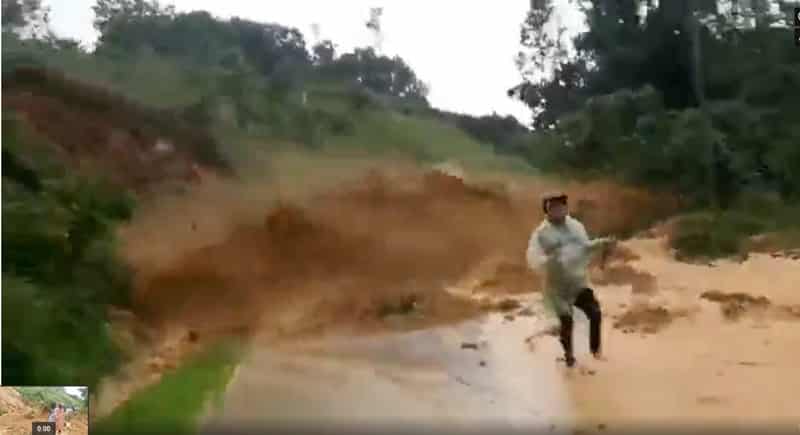 Một người đang ghi hình lại thì bất ngờ phía trên đầu có tiếng nổ lớn liền la thất thanh “Chạy, chạy, chạy đi…”. Mọi người nghe tiếng hét liền bỏ chạy. Trong tích tắc, đất nhão chảy tràn xuống ào ạt, cuộn xuống vực. Có người chạy không kịp bị đất cuốn vùi lấp mất tích.