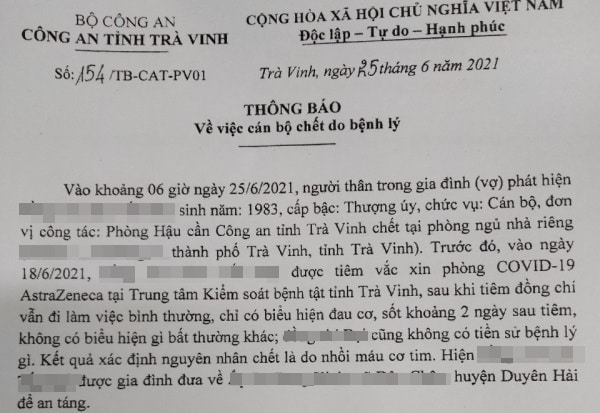 Cho hay thượng úy công an không có tiền sử bệnh lý, Công an tỉnh Trà Vinh công bố người này tử vong một tuần sau khi tiêm vắc-xin ngừa COVID-19 do “nhồi máu cơ tim”.