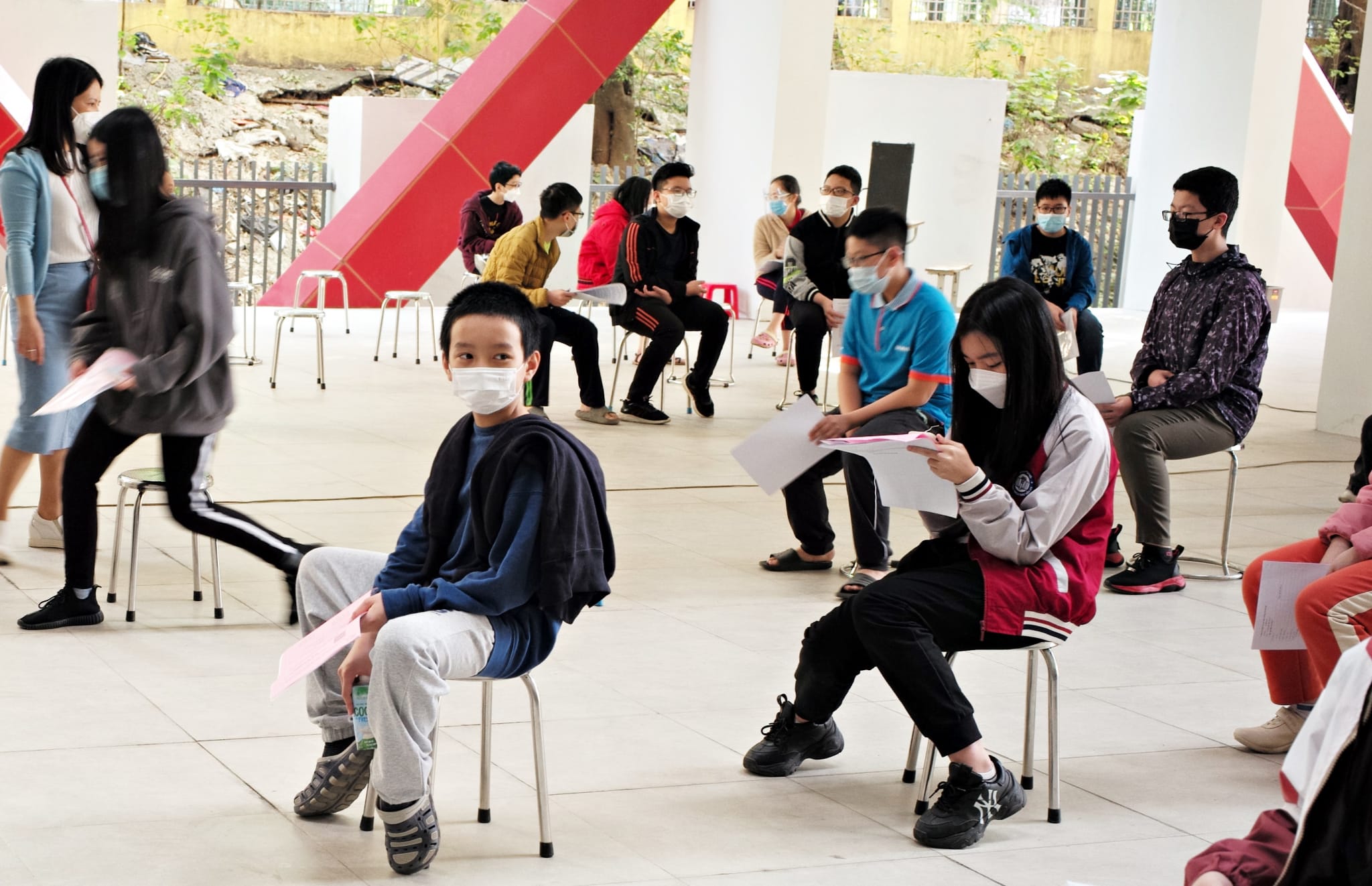 Một nhóm trẻ 12-17 tuổi tại một điểm tiêm vắc-xin COVID-19 tại Hà Nội, ngày 5/12/2021. (Ảnh minh họa: NamLong Nguyen/Shutterstock)