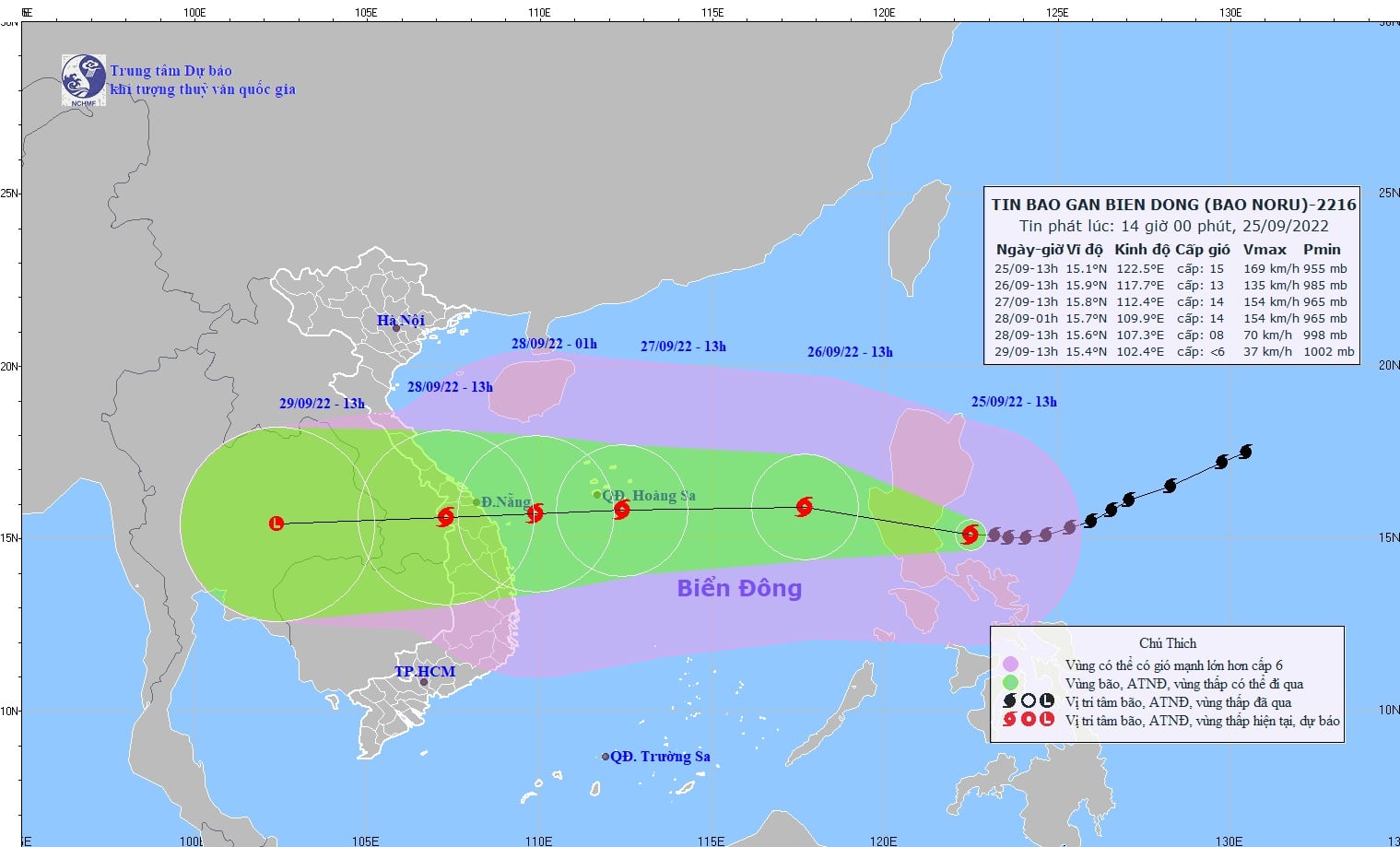 Theo Trung tâm Dự báo Khí tượng Thủy văn Quốc gia, lúc 13h ngày 25/9, vị trí tâm bão Noru ở khoảng 15,1 độ Vĩ Bắc; 122,5 độ Kinh Đông, cách đảo Luzon (Philippines) khoảng 110km về phía Đông. Sức gió mạnh nhất vùng gần tâm bão mạnh cấp 15 (167-183km/giờ), giật trên cấp 17.
