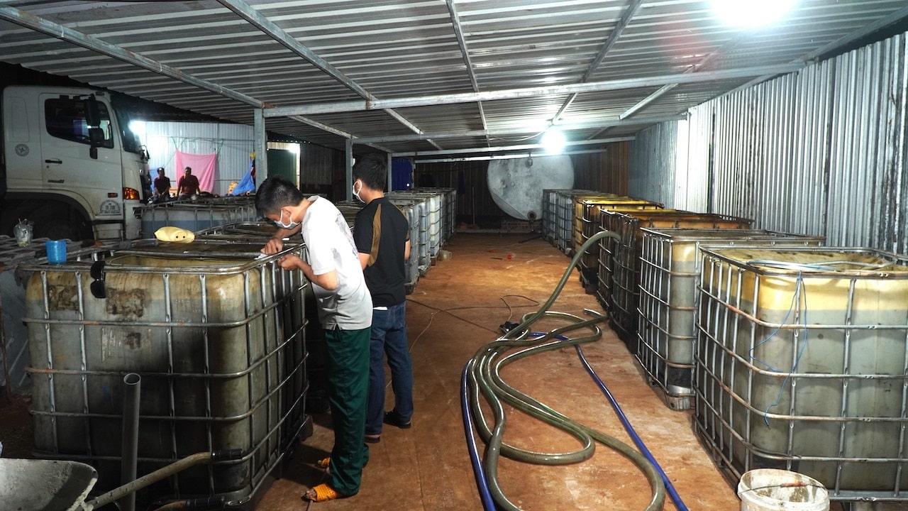 Bên trong cơ sở tái chế nhớt thải rộng khoảng 700m2, quây tôn kín, có 5 người đang nấu nhớt thải. Khoảng 22.000 lít dầu nhớt thành phẩm, 5.000 lít nhớt thải chưa qua tái chế, 130 can axit, 10 bao hóa chất bị phát hiện tại chỗ. Lò nấu, máy bơm, bồn chứa, đường ống, hệ thống điện… được thiết lập cố định, quy mô để chưng cất và pha chế dầu nhớt thải.