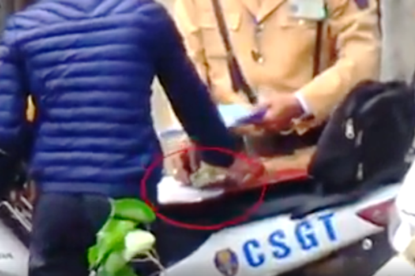Đoạn clip dài hơn 7 phút, nhiều hình ảnh cho thấy người vi phạm giao thông rút trong ví ra các tờ giấy giống các tờ tiền mệnh giá 100.000 – 200.000 đồng hoặc cầm trên tay đưa trực tiếp và kẹp vào tập hồ sơ của CSGT, sau đó những người vi phạm được đi ngay mà không bị lập biên bản.