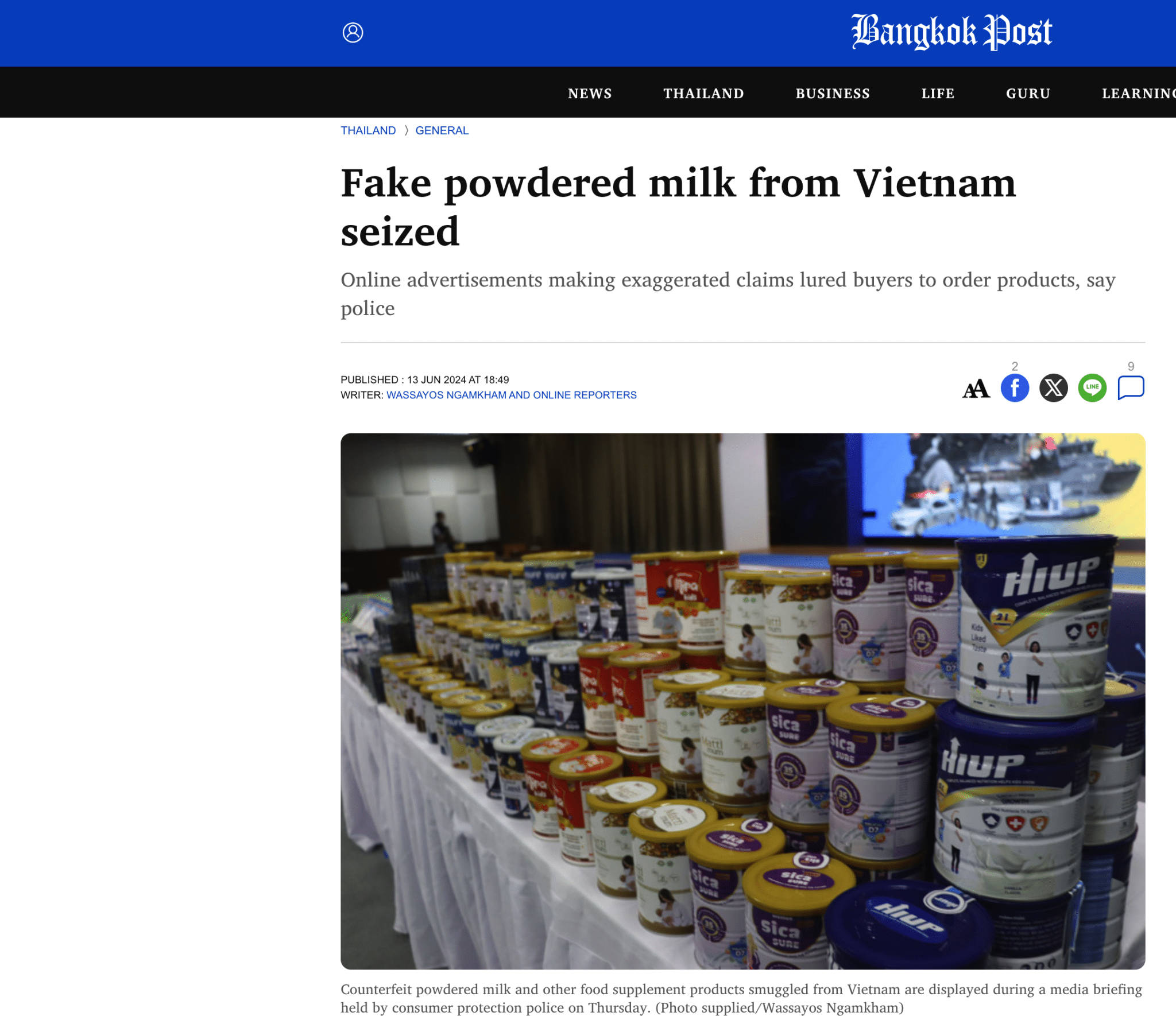 Bangkok Post và Thai.News đưa tin các lực lượng thuộc Phòng Cảnh sát Bảo vệ Người tiêu dùng (CPPD) và Cục Quản lý Thực phẩm và Dược phẩm (FDA) thu giữ 41 tang vật cùng khoảng 20.000 hộp sữa bột và các sản phẩm thực phẩm bổ trợ khác từ kho hàng.