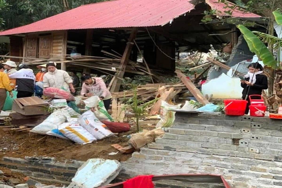 Nhiều tảng đá lớn lăn từ núi Làng Cả xuống, đè sập ngôi nhà của người dân, hai người trong nhà may mắn chạy thoát.