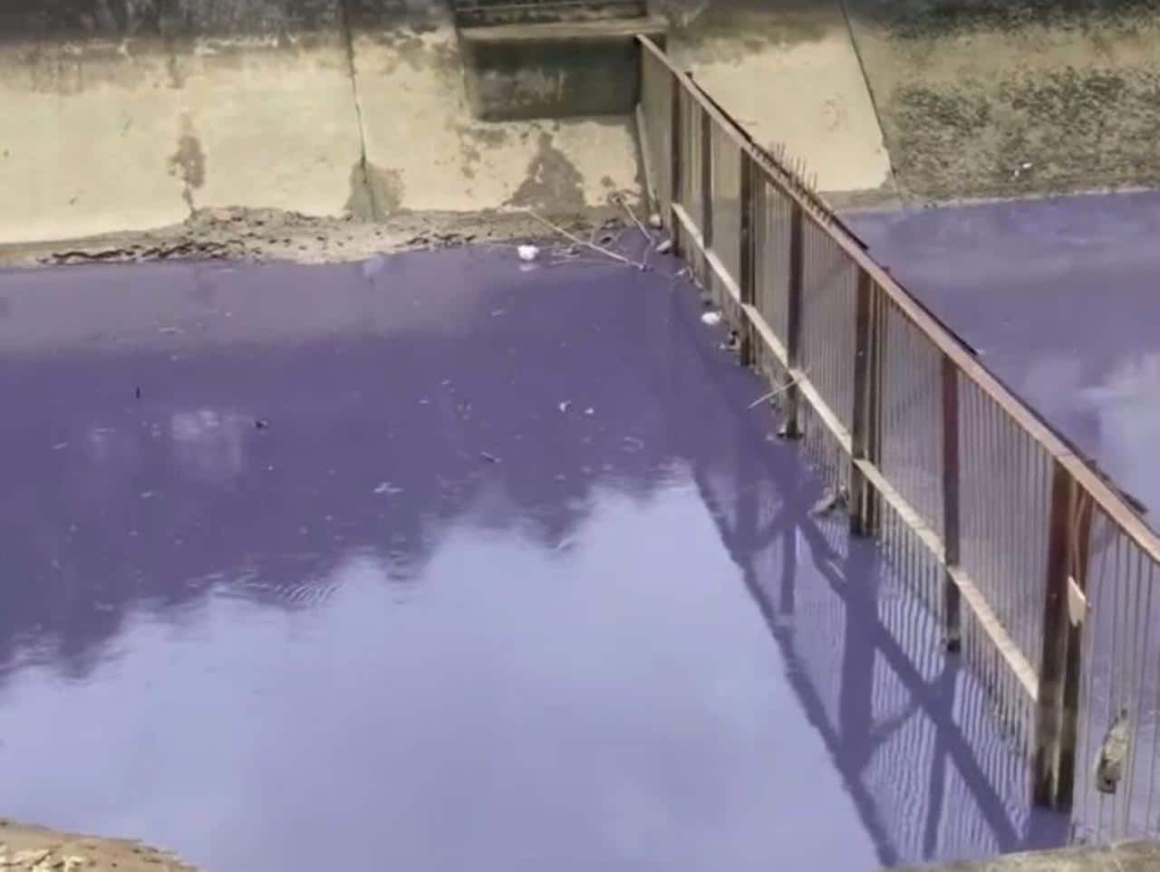 Người dân lo lắng khi nước tại khu vực kênh tiêu 19.5 bất ngờ chuyển màu tím kéo dài hàng trăm mét. (Ảnh cắt từ clip/Facebook)