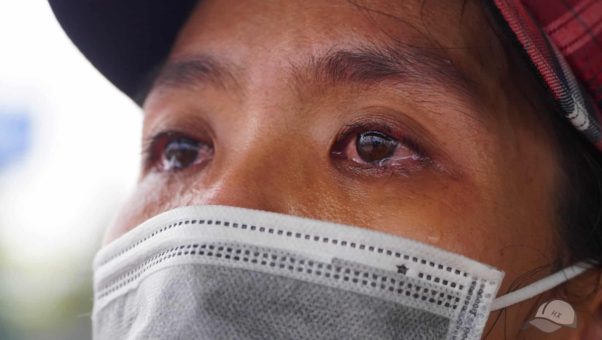 Đôi mắt ngầng ngậc nước của một phụ nữ tháo chạy về quê, trên Quốc lộ 1, ngày 5/10. (Ảnh: Huế Xuân Nguyễn/Facebook)