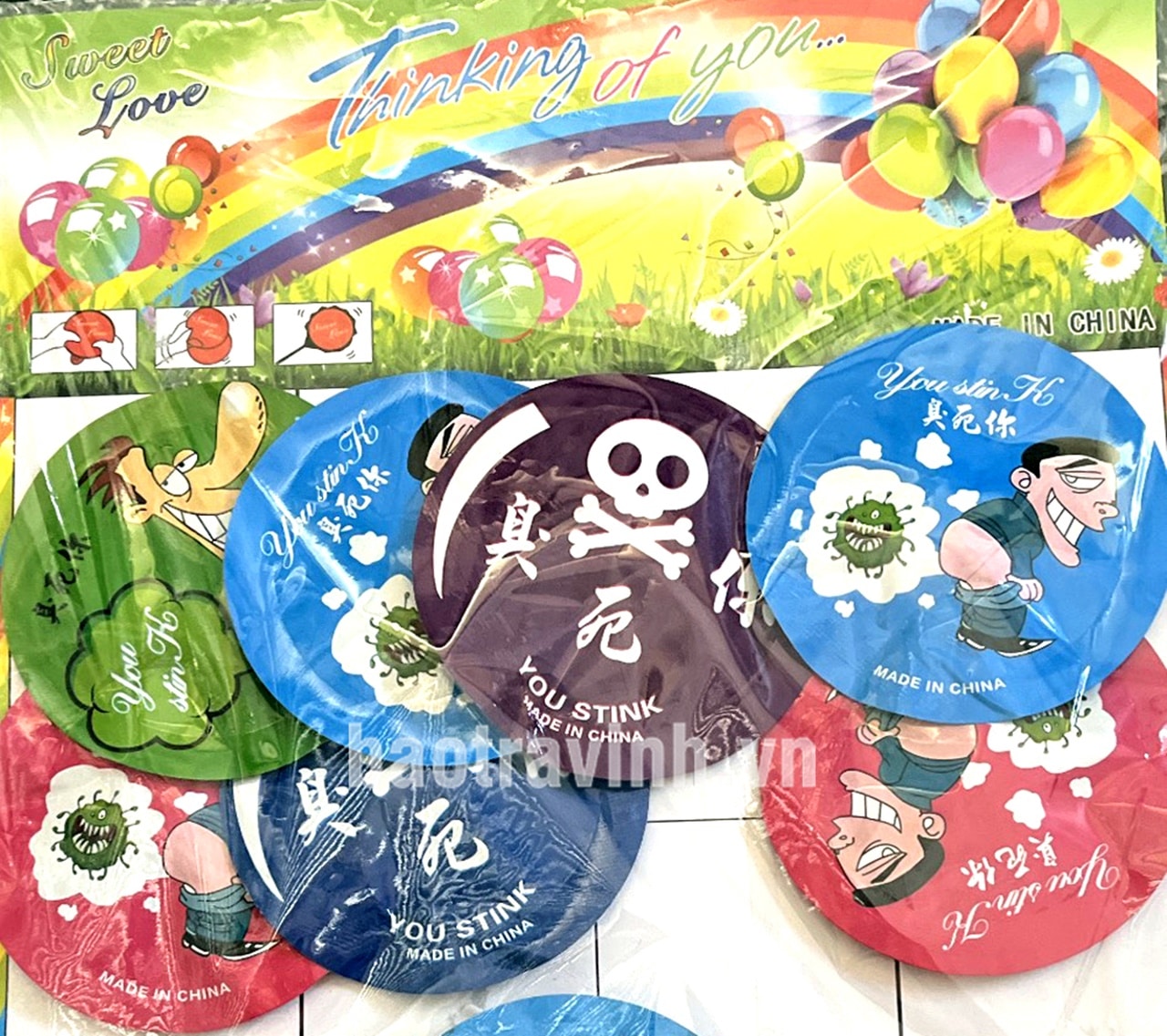Bóng nổ (hay còn gọi là bóng thối) bị thu giữ từ cửa hàng tạp hóa mà nhóm học sinh mua. (Ảnh: baotravinh.vn)