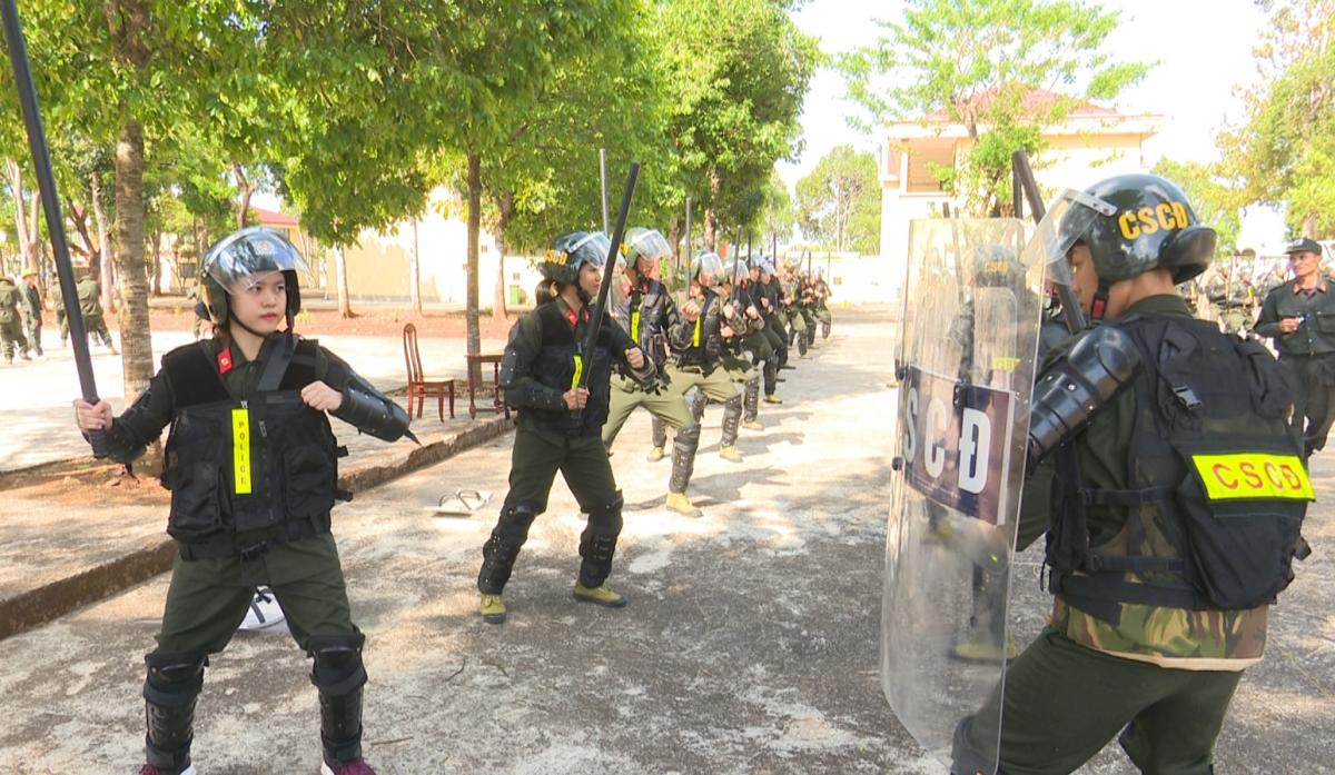 Cảnh sát cơ động thuộc Trung đoàn Cảnh sát cơ động Tây Nguyên trong một buổi luyện tập ngăn chặn, trấn áp các vụ gây rối, tháng 4/2021. (Ảnh minh họa: baodaklak.vn)