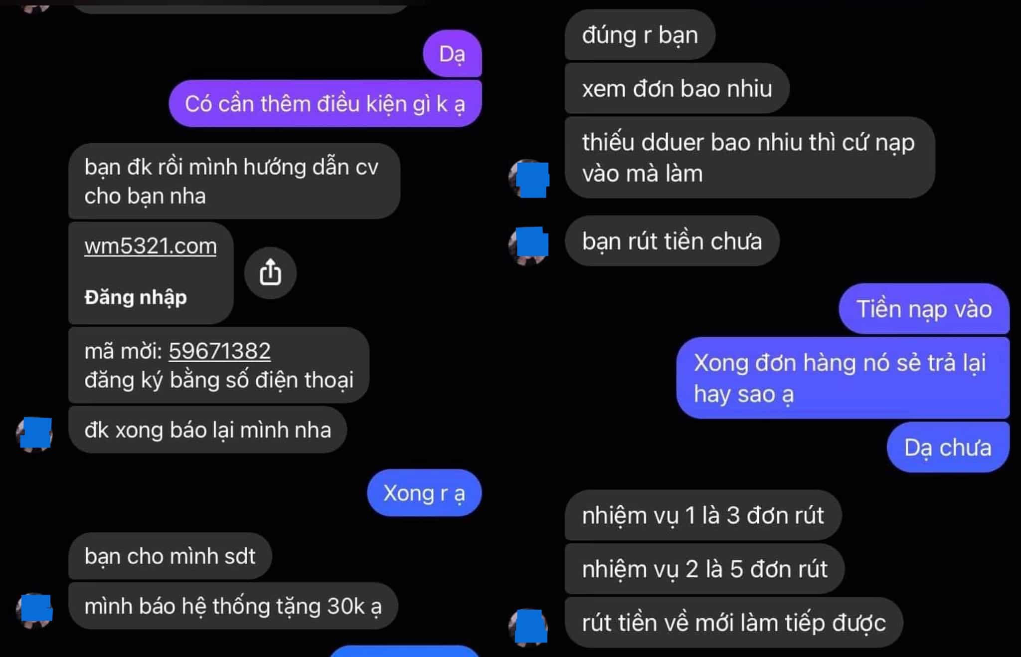 Theo lời chị X., sau khi xin làm CTV mua bán hàng, được họ gửi một đường link sản phẩm thật trên các sàn thương mại điện tử, yêu cầu tạo đơn hàng và thanh toán. Hệ thống sẽ hoàn tiền, kèm theo hoa hồng. Nguyên tắc do nhóm này đặt ra là “nhiệm vụ 1 là 3 đơn rút, nhiệm vụ 2 là 5 đơn rút, rút tiền về sau đó tiếp tục làm”…