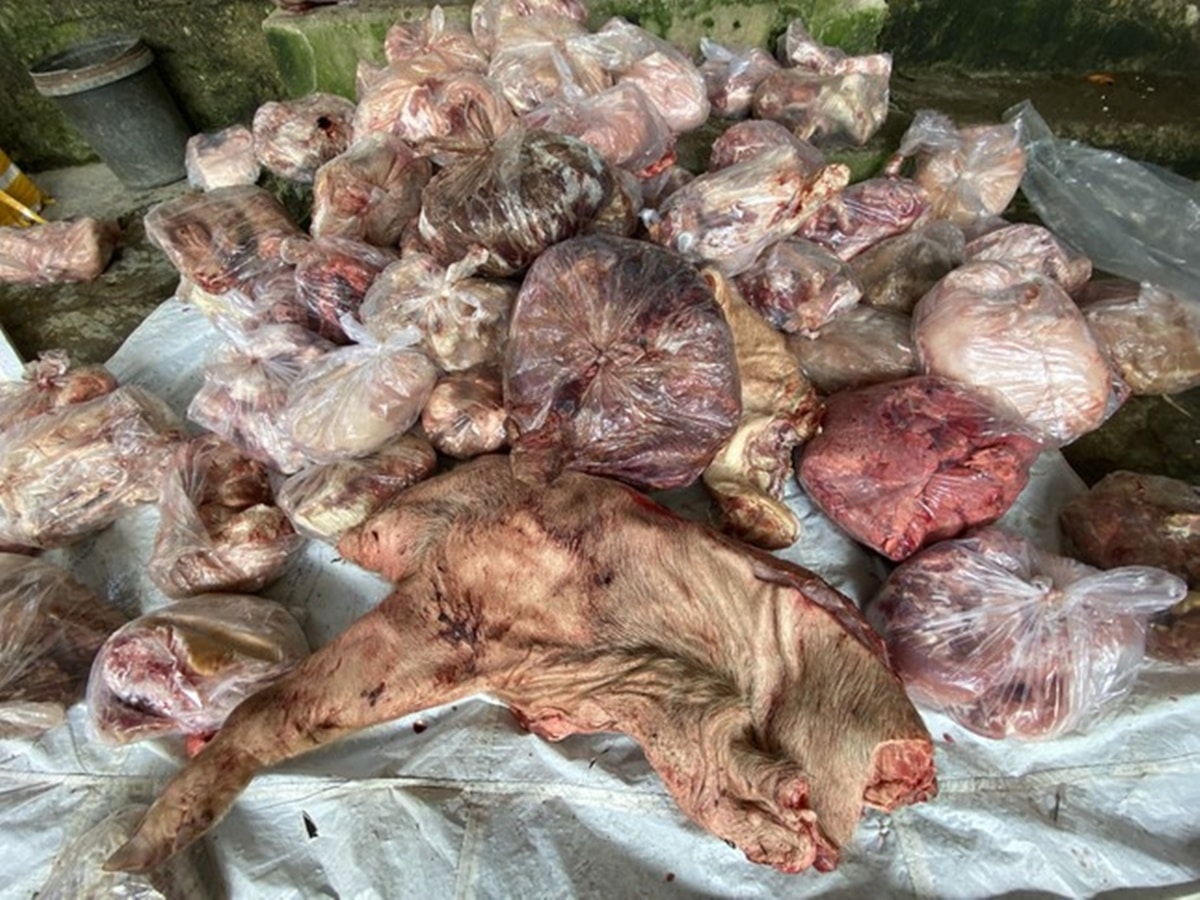 Tại thời điểm kiểm tra, một lượng lớn thịt lợn và nội tạng lợn đã biến đổi màu, bốc mùi hôi thối, tổng trọng lượng khoảng 3 tấn.