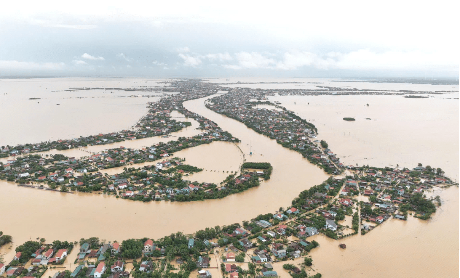 Vùng lũ Lệ Thuỷ (Quảng Bình) nước lũ dâng cao gần chạm nóc nhà cấp 4, chỉ còn cách đỉnh lũ lịch sử 2020 khoảng hơn 50cm, theo báo VTC News.