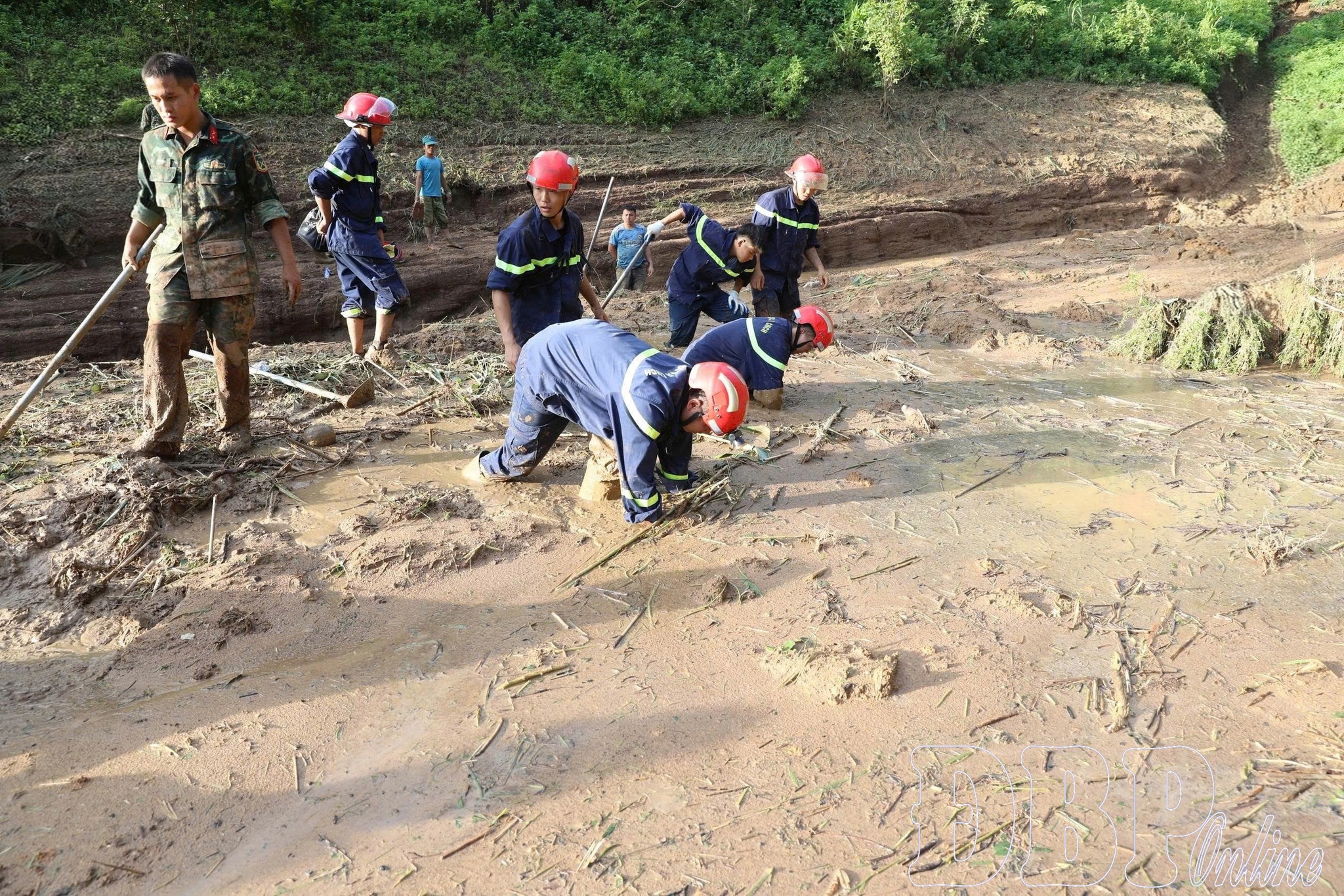 Hàng tấn đất bùn, đá lớn, thân cây lớn tại hiện trường. Lực lượng tìm kiếm gồm công an, quân đội, dân quân tự vệ và người dân địa phương. Máy xúc, máy ủi cũng được huy động để hỗ trợ dọn dẹp vật cản, trong khi người dùng xẻng bới tìm.