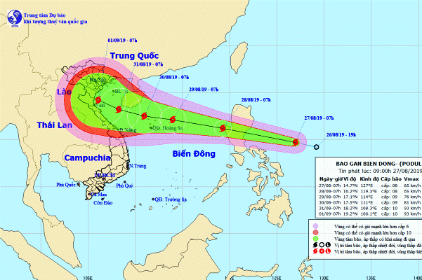 Hồi 7h ngày 27/8, vị trí tâm bão ở vào khoảng 14,7 độ Vĩ Bắc; 127,0 độ Kinh Đông, cách đảo Ludong (Philippines) khoảng 550km về phía Đông Đông Nam. Sức gió mạnh nhất vùng gần tâm bão mạnh cấp 8 (60-75km/giờ), giật cấp 10.