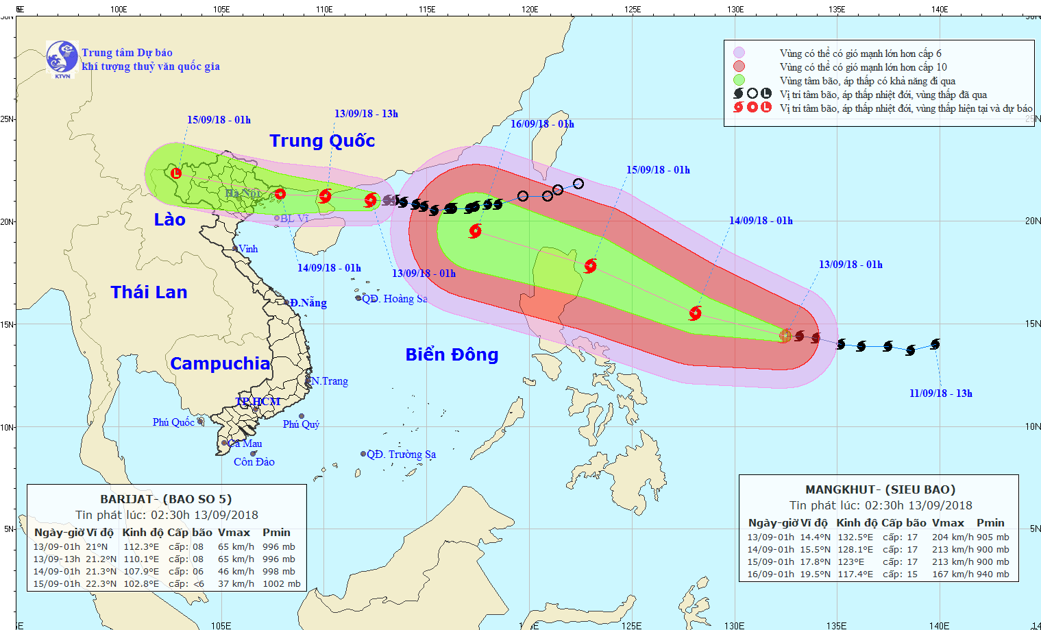 Dự báo, bão số 5 sẽ suy yếu thành áp thấp trước khi đổ bộ vào đất liền các tỉnh từ Quảng Ninh-Hải Phòng; còn bão Mangkhut hiện có sức gió giật cấp 17, dự báo sẽ di chuyển theo hướng Tây Tây Bắc tiến vào biển Đông nước ta.