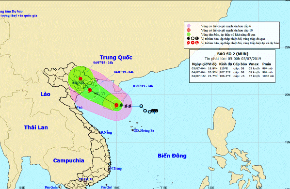 Theo Trung tâm Dự báo Khí tượng Thủy văn Trung ương, hồi 4 giờ ngày 3/7, vị trí tâm bão số 2 ở vào khoảng 18,9 độ Vĩ Bắc; 110,0 độ Kinh Đông, trên khu vực phía Đông đảo Hải Nam (Trung Quốc), cách đất liền các tỉnh Quảng Ninh-Hải Phòng khoảng 410km về phía Nam Đông Nam. Sức gió mạnh nhất vùng gần bão mạnh cấp 8 (60-75km/giờ), giật cấp 11. Bán kính gió mạnh cấp 6, giật cấp 8 trở lên khoảng 100km tính từ tâm bão.