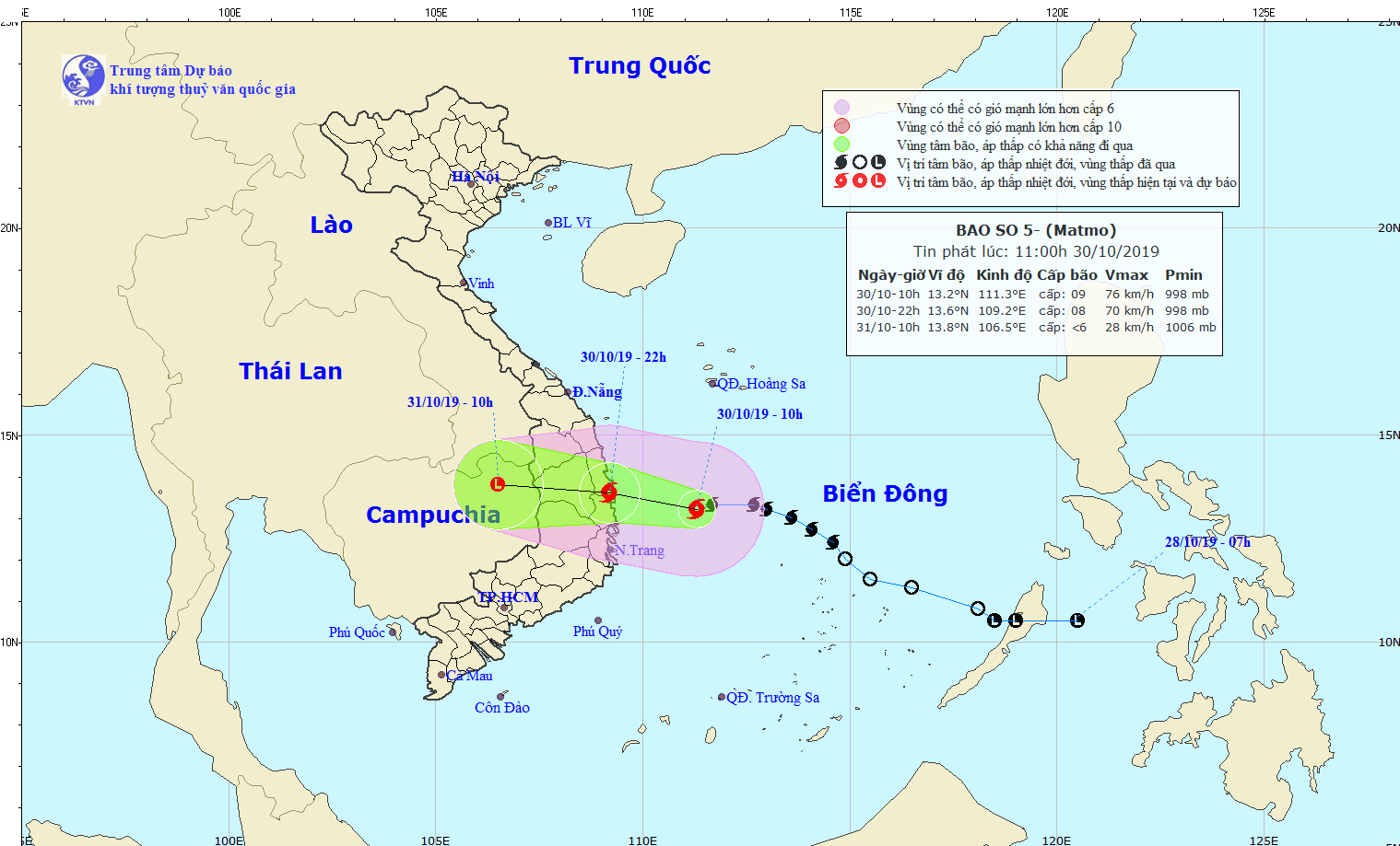 Theo Trung tâm Dự báo Khí tượng Thủy văn Trung ương, hồi 10h ngày 30/10, vị trí tâm bão ở vào khoảng 13,2 độ Vĩ Bắc; 111,3 độ Kinh Đông, cách đất liền các tỉnh Bình Định-Khánh Hòa khoảng 200km về phía Đông. Sức gió mạnh nhất vùng gần tâm bão mạnh cấp 9 (75-90km/giờ), giật cấp 11. Bán kính gió mạnh từ cấp 6, giật từ cấp 8 trở lên khoảng 130km tính từ tâm bão.