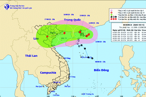 Dự báo trong 24h tới, bão di chuyển theo hướng Đông, mỗi giờ đi được khoảng 5km. Đến 10 giờ ngày 14/8, vị trí tâm bão ở khoảng 20,9 độ Vĩ Bắc; 113,3 độ Kinh Đông, trên vùng biển phía Nam tỉnh Quảng Đông (Trung Quốc). Sức gió mạnh nhất vùng gần tâm bão mạnh cấp 8 (60-75km/giờ), giật cấp 10. Phạm vi gió mạnh cấp 6, giật cấp 8 khoảng 100km tính từ tâm bão.