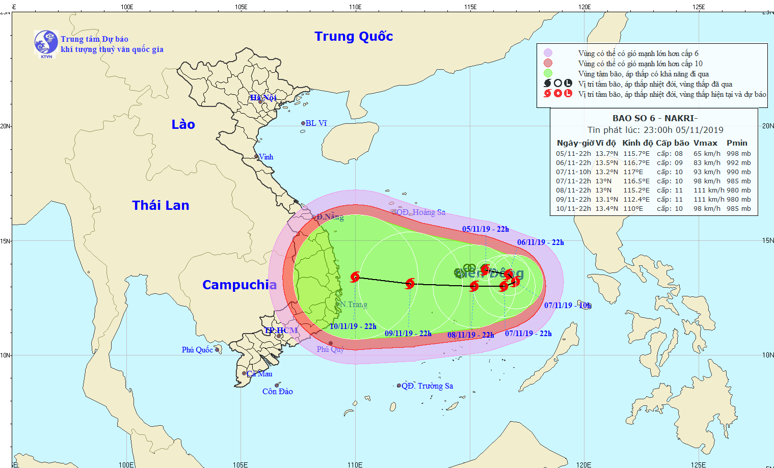 Theo Trung tâm Dự báo Khí tượng Thủy văn Quốc gia, hồi 22 giờ ngày 05/11, vị trí tâm bão ở vào khoảng 13,7 độ Vĩ Bắc; 115,7 độ Kinh Đông, cách đảo Song Tử Tây (quần đảo Trường Sa) khoảng 290km về phía Bắc Đông Bắc. Sức gió mạnh nhất vùng gần tâm bão mạnh cấp 8 (60-75km/giờ), giật cấp 10. Bán kính gió mạnh từ cấp 6, giật từ cấp 8 trở lên khoảng 100km tính từ tâm bão.