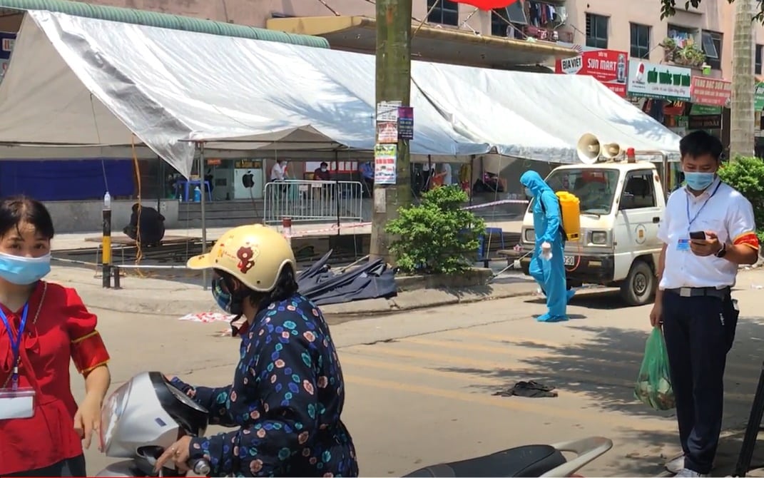 Tòa nhà C, khu CT10, chung cư Đại Thanh, xã Tả Thanh Oai (huyện Thanh Trì) bị phong toả sáng 11/5 sau khi ghi nhận một ca nghi nhiễm Covid-19. (Ảnh: CTV/Trí Thức VN)
